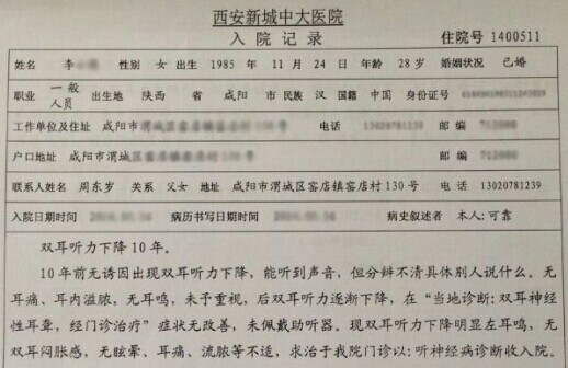 这名女患者叫李梓涵(化名),28岁,家住咸阳市,10年前双耳突然出现听力下降,能听到声音,没有耳痛、耳内溢腺、耳鸣等症状,当时她并没有特别重视,后来双耳听力严重下降,几乎听不清别人在说什么,李小姐意识到病情的严重性,于是去了当地医院做检查,被诊断为双耳神经性耳聋,当地医院给李小姐做了相关的治疗,但是听力一定没有得到改善。