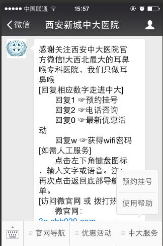 准备就医时,患者可打开“西安新城中大耳鼻喉医院”微信服务号,了解优惠活动或在“中大服务”一栏,选择“预约挂号”进行挂号,填写基本信息选择相应的科室之后,患者在微信中会收到一条缴费提醒,点击即可支付挂号费。实地体验微信挂号流程,整个过程不到一分钟,非常便捷。