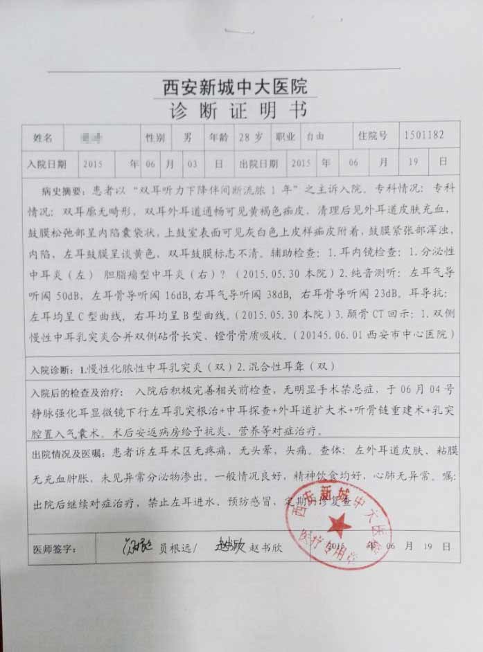 2015年6月4日中大医生张全安教授通过耳内镜、纯音测听、耳导抗为樊先生检查后结果显示:他的左耳为分泌性中耳炎,右耳为胆脂瘤型中耳炎;左耳气导听阈50dB,左耳骨导听阈16dB,右耳气导听阈38dB,右耳骨导听阈23dB;左耳均呈C型曲线,右耳均呈B型曲线。检查结果表明:樊先生左耳为中度听力损失,右耳为轻度听力损失。