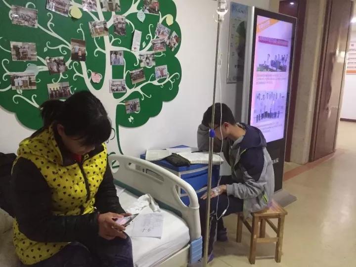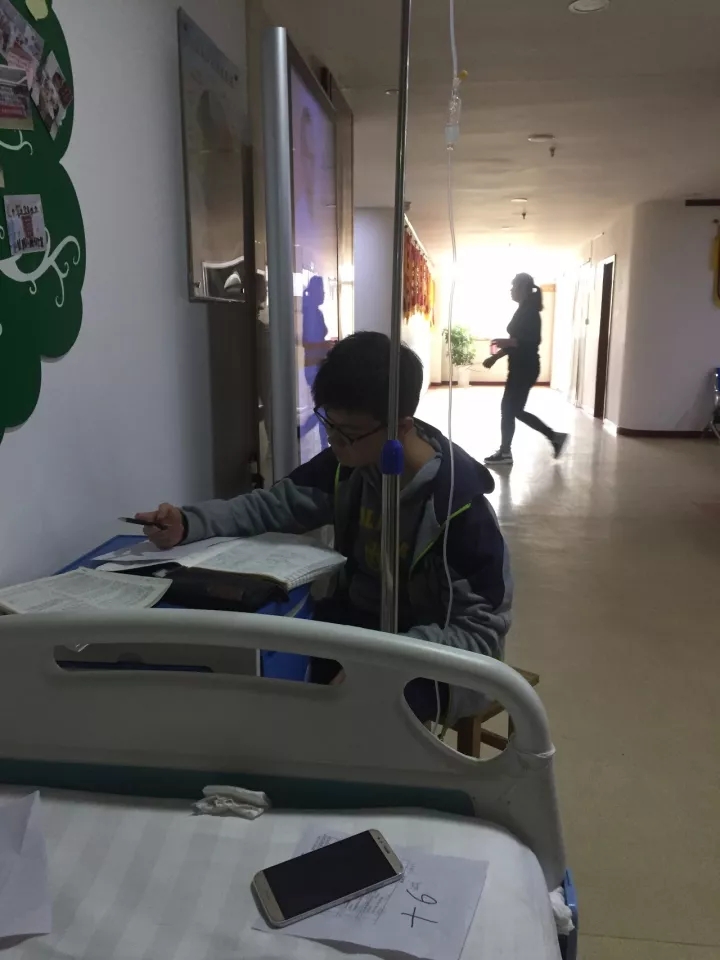 小闫一边输液,一边认真复习功课,妈妈在一旁陪着